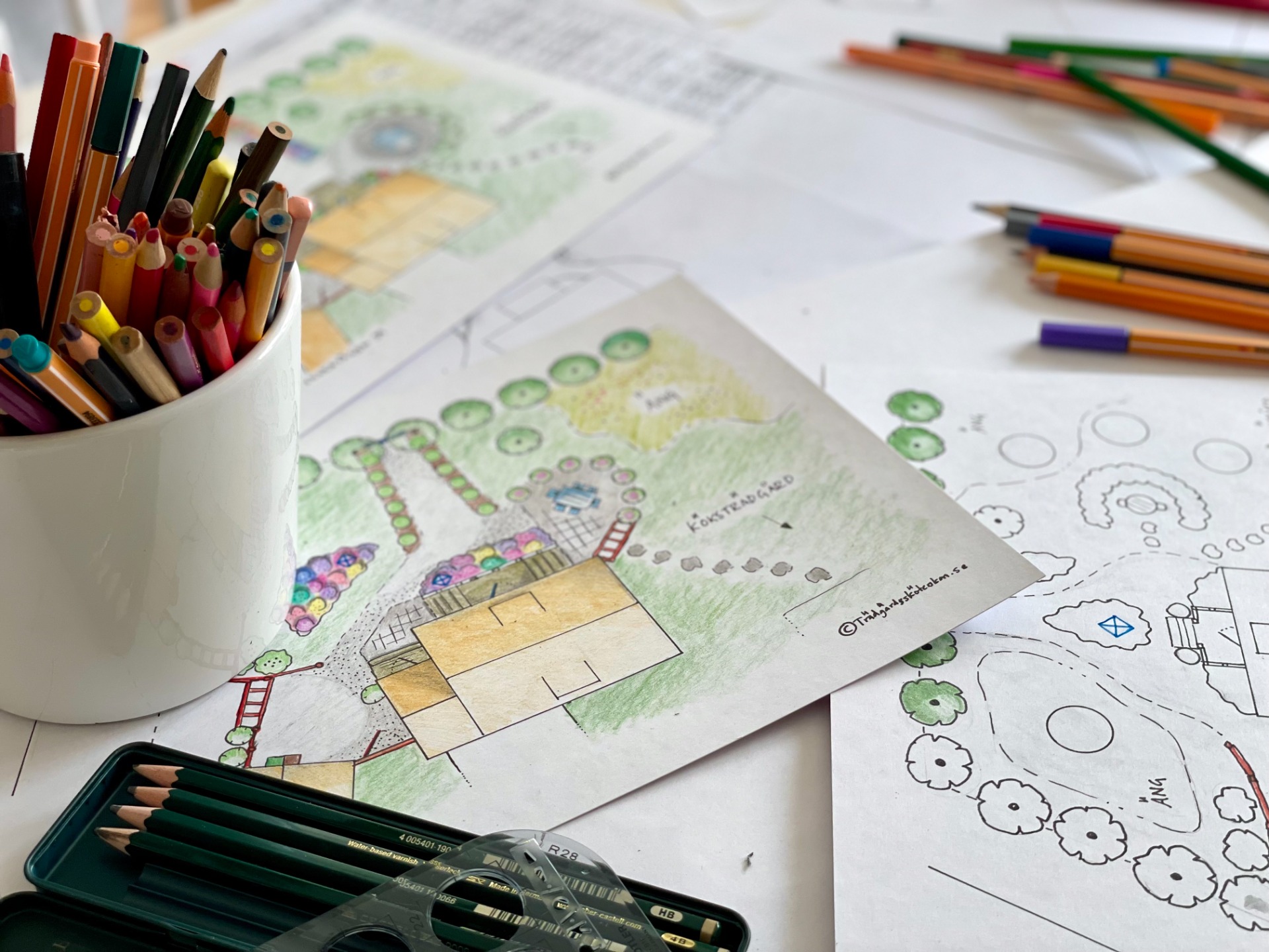 Trädgårdsskisser i tre olika varianter.