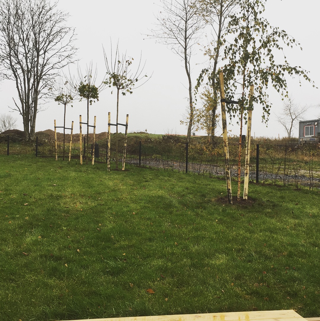 Plantering av träd och häck i nyanlagd trädgård.