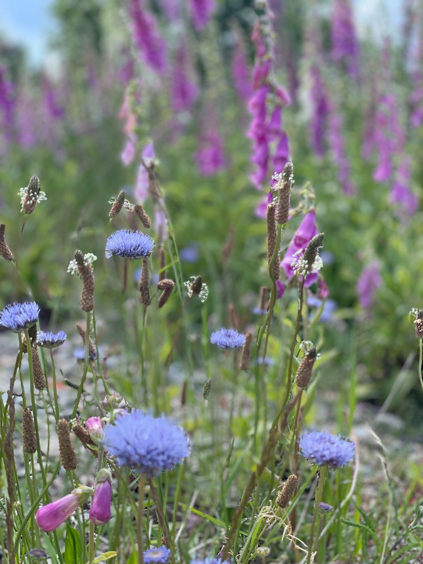 Naturlig äng vid havet i Åsa. Blåmunkar och Svartkämpar i förgrunden och i bakgrunden Fingerborgsblommor.
